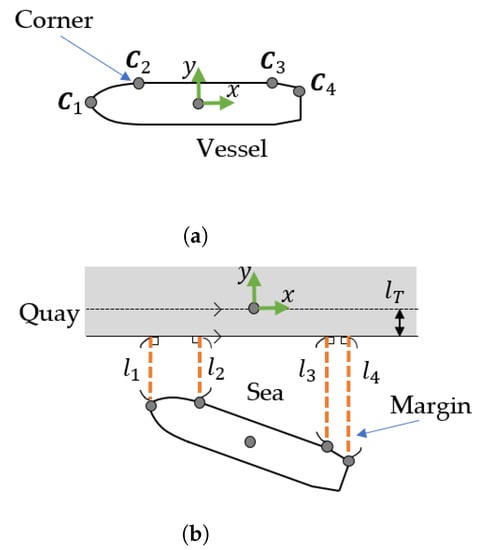 Margin between a vessel and its quay: (a) vessel-based coordinate system; (b) quay-based coordinate system.