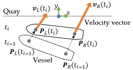 Figure 5 shows the calculation of the bow and stern velocity vectors. and refer to the predicted positions, and their velocity vectors are and , respectively. The velocity vectors and of and are obtained using Equations (6) and (7), respectively. They were obtained by dividing the displacements moving in time t from to Then, the estimated trajectory for linear motion of the vessel only can be easily obtained by Equations (8) and (9) using and , respectively, but not for curvilinear motion.
