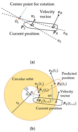 To estimate the trajectory of the vessel’s curvilinear motion, it is necessary to find the center point to realize a curvilinear motion. Here, as shown in Figure 6a, point , where the two dotted lines, and , perpendicular to each velocity vector of the bow and stern intersect, is assumed to be the center point for rotating the vessel. In addition to this center point, the radius of rotation and angular velocity at the current positions of the bow and stern are required, and these parameters can be obtained using the respective velocity vectors of the bow and stern.