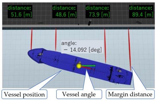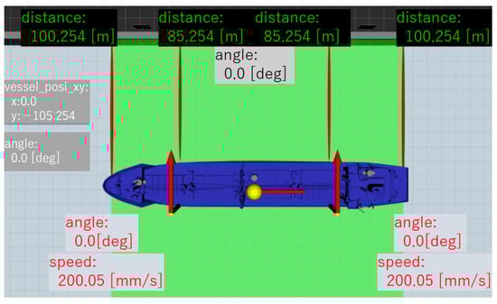 To verify the representation of the positioning of a vessel, a trial simulation was performed by manually providing distance data for the parameters described in Section 2.1. For example, if the distance data of and are set to 60 [m] and 100 [m], and the angles of and are set to 0.3 [rad] and −0.2 [rad], respectively, and the vessel’s positioning on the visualization interface can be displayed, as shown in Figure 7. Here, the length, width, and baseline between the distance-measuring instruments of the vessel were 203, 30, and 173 [m], respectively. The four vertical lines between the model vessel and quay shown in Figure 7 represent the margins, with each marginal distance visible above the quay wall. The heading, which is the attitude angle of the model vessel relative to the quay wall, is represented by the angle of −14.092 [deg] in the center of the same figure. From Figure 7, it is confirmed that the visualization interface developed in this study can be represented using distance data to the quay from the two distance-measuring instruments on board the vessel.