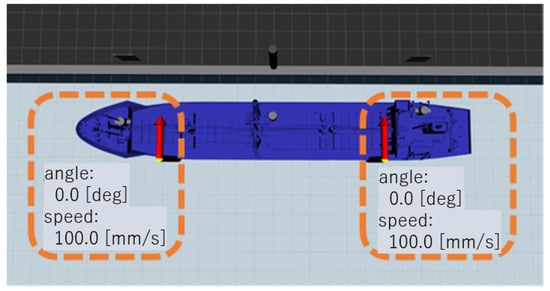 To verify that the velocity of a berthing vessel on the visualization interface can be correctly represented as it approaches the quay and its vector, simulation at a certain velocity was tentatively carried out. Figure 8 shows a scene of the visualization interface, where the velocity of 100 [mm/s] and its vector are represented together. The angle 0.0 [deg] and speed 100.0 [mm/s] in the perforated rectangles on the bow and stern sides indicate the velocity of the model vessel approaching the quay and its direction, confirming that the approach velocities and described in Section 2.2 can be represented visually. The angles and velocities in Figure 8 are also visualized with red arrows and yellow poles, respectively, because they have the potential to serve as a reference for the forces to be pushed by the tugboat.