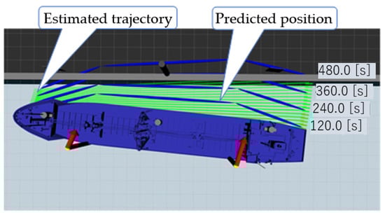 In addition, to validate the visualization method of the predicted position for the time-mobile berthing vessel described in Section 3.1, the predicted position of the vessel and its estimated trajectory are rendered in Figure 9. The green area between the vessel and quay represents the estimated trajectory of a moving vessel. The blue lines in the green area indicate the predicted position of the vessel after 120, 240, 360, and 480 [s], respectively.