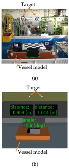 Figure 10b shows the rendering results for the position and heading of the model vessel relative to the simulated quay. The upper row of Figure 10b shows the two targets on the quay, and the lower row shows the position and heading of the model vessel at distances of 0.959 [m], 1.014 [m], and −1.6 [deg] to the quay. In other words, as seen by comparison with Figure 10a, the status changes of the vessel’s position and heading can be represented on the visualization interface.