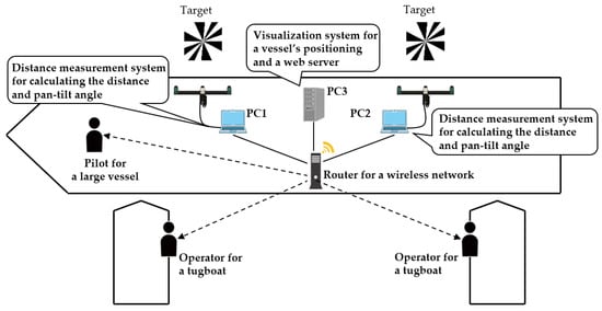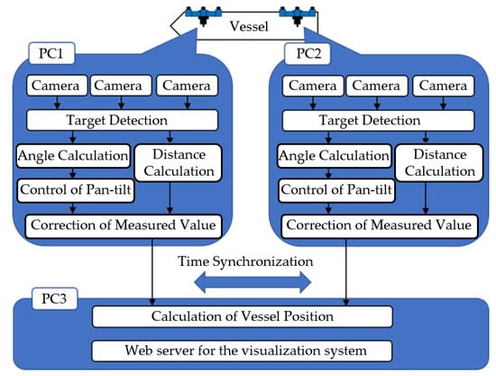 Each system in Figure 12 can be analyzed by functional node: PC1 and PC2 detect markers or targets from images acquired by their respective cameras. For target or marker detection, template matching using the vector code correlation method [12] is used. After the matching process, the distance from each measuring instrument to the target and pan-tilt angle required for tracking the target are calculated, and noise correction is performed on the calculated values. The measured values, distance, and pan-tilt angle, obtained from the two machines PC1 and PC2, are the input to a PC3 equipped with the visualization system, which calculates and draws the vessel’s positioning and heading. At this time, time synchronization is performed between PC1 and PC2 to achieve accurate ship’s position drawing. This process is performed using the message_filters library of ROS, which includes a function called TimeSynchronizer. This function treats data with similar time stamps in the ros_message of distance information as data of the same time. Thus, the measuring and drawing processes are distributed using multiple machines. The PC1 and PC2 used here are commercial Note PCs with 3.6 [GHz] CPUs, and PC3, used as a web server for the visualization system, is a general desktop PC with a GTX1060 GPU.