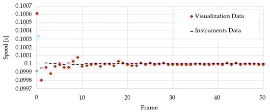 Figure 14 also shows the speed of drawing successive distance data on the PC3 server, as described in Section 4.1. The first frame of the drawing process for the input values is only delayed by approximately 0.7 [ms]. This delay may be attributable to the start-up process of the visualization system at the beginning of the measurement. Subsequently, the drawing speed is stable at 10 Hz, and it can be confirmed that the drawing is performed at almost the same time as the speed of the input distance data [14]. The drawing speed of 10 Hz here is the target value for input distance data. If the screen display is slower than this, there is a sense of psychological frustration until it is displayed on the screen, so there is no comparison with other systems, and the user cannot use the system stably.