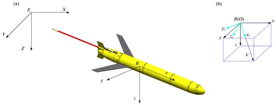 To establish the kinematical model of “Petrel II” UG, three reference frames of the UG, including the inertial frame, the body frame and the velocity frame, are firstly chosen (see Figure 2). The entry point of the UG is chosen as the origin of the inertial frame E-XYZ, in which the EX-axis locates in the horizontal plane and points to the north, the EZ-axis, perpendicular to the horizontal plane, points downward, and the EY-axis satisfies the right-hand rule. The body frame B-xyz, fixed on the UG, locates the buoyancy center of the UG, with the Bx-axis pointing to the fore along its longitudinal axis, the By-axis, perpendicular to the Bx-axis, pointing to the starboard side of the UG, and the direction of the Bz-axis determined by the right-hand rule. Similar to the body frame, the velocity frame O- also selects the buoyancy center as its origin, with the -axis pointing forward along the velocity, the -axis in the Bxz plane, perpendicular to the -axis, and the direction of the -axis meeting the right-hand rule.