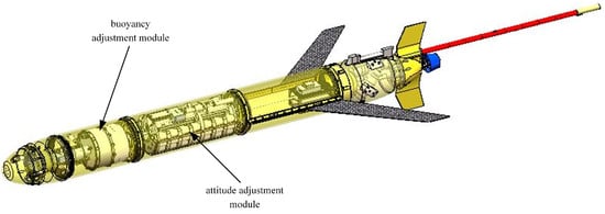 The “Petrel II” UG is composed of the main body (including the pressure hull, two wings, antenna and other appendages), the buoyancy adjustment module and the attitude adjustment module (shown in Figure 3). The mass center of the main body does not coincide with the buoyancy center, and in general, the mass is expressed as mm. By changing the displaced volume of the UG, the buoyancy adjustment module produces the required buoyancy with the buoyancy center located at the Bx-axis [38], which is represented as mb. The battery package with the mass denoted as mp adjusts the attitude by moving along and rotating around the Bx-axis to change the pitch angle and roll angle, respectively. The external forces acting on the UG during its navigation include hydrodynamic force and other external forces (including buoyancy and gravity).