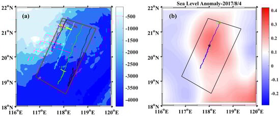 (a) The trajectories of 12 UGs from 4 August 2017 to 29 August 2017 in the South China Sea (the red rectangle highlighted the surveyed domain and the contours on the background represent the isobaths). (b) The trajectory of UG 6 in August 2017 (shown on the SLA map in the domain).