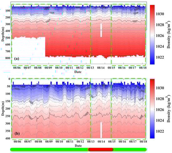 In Figure 5a, the density increases from 1020.0 kg/m3 (near the sea surface) to 1031.6 kg/m3 (depth < 900 m) with the increase of depth. Near the depth of 100 m, a sinking of isopycnals can be seen obviously, indicating that the presence of the anticyclonic eddy changes the steady stratification of seawater. To better display the density distribution within the eddy, the upper water column of 0∼400 m is isolated from the whole depth, as shown in Figure 5b. From August 13 to 15 (marked as the red bar below Figure 5b), UG 6 sailed outside the eddy and took transects inside the eddy during the rest time (marked as the green bar). In Figure 5b, the isopycnals present a bowl-shaped descending, where the closer the isopycnals are to the eddy center, the deeper they descend, while the farther they are to the eddy center, the shallower they descend.