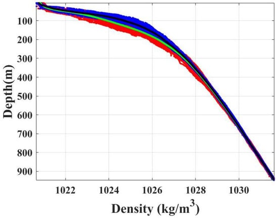 To compare the difference of the density distribution inside and outside the eddy, the whole navigation of UG 6 is divided into three sections: August 5∼12, 13∼15 and 16∼18. During August 5∼12 and 16∼18, UG 6 worked within the eddy; thus, the data collected revealed the density distribution within the eddy. To present the relationship between the density within the eddy and the depth, the data during these periods are extracted and plotted in Figure 6 (marked as red dots in Figure 6). UG 6 navigated outside the eddy during August 13∼15, and the collected data showed the density without the eddy (shown as blue dots in Figure 6). In Figure 6, the green and black solid lines represent the mean density variability inside and outside the eddy, respectively. Comparing the density distribution within and without the eddy in Figure 6, it can be found that the density difference is mainly located near 50∼400 m. Within the depth range, the density inside the eddy is smaller than that outside the eddy, and the maximum difference reaches 0.082 kg/m3.