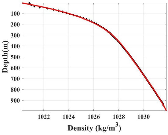 The fitting curve is shown in Figure 7, where the black square represents the mean value of the density within the eddy, and the solid red solid line means the quintic polynomial fitting curve. From Figure 7, the quintic polynomial fits the mean density distribution of the mean density within the eddy well.