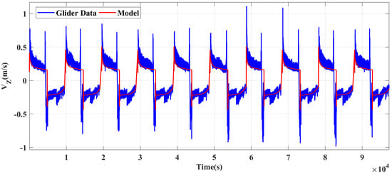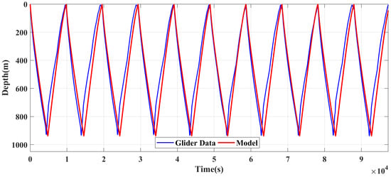 Equipped with a SeaBird Glider Payload CTD (described in Section 2.2.1), UG 6 provided the information on the gliding depth along its trajectory, as shown in Figure 8. In Figure 8, the blue and red lines represent the gliding depth obtained from the field experiment and the dynamic model, respectively. Inside the anticyclonic eddy, the vertical velocity is vertically downward in the inertial frame. So, UG 6 descended a little faster in the field experiment than in the simulation during the diving stage. However, the UG ascended slower in the field experiment than in the simulation during the climbing stage. So, the depth difference between the field experiment and simulation is gradually increasing in the descent and reducing in the ascent. Considering that the vertical velocity inside the anticyclonic eddy is about 0.02 m/s at the sea surface and gradually decreases with the increasing depth [44], and the mean vertical velocity of UG is about 0.2 m/s when UG remains stable [42], the effect of the eddy vertical velocity on the motion of UG in the vertical plane is negligible. Assuming that the vertical velocity inside the anticyclonic eddy has a negligible effect on the UG, the gliding depth of UG 6 has a better alignment with that of the model, which means the established dynamic model considering the effect of the density distribution within an eddy has high accuracy in predicting the vertical trajectory of UGs within the eddy. Moreover, the data from the simulations agree better with the experimental data in the descent compared with the ascent, indicating that the dynamic model has a higher prediction accuracy for the descent.