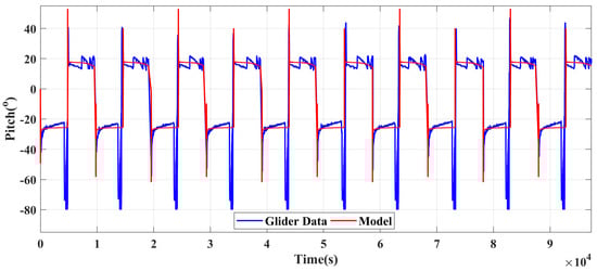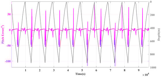 The pitch angle values were acquired by a TCM3 digital compass mounted on UG 6. The pitch angles from UG 6 and the dynamic model are presented in Figure 9. In Figure 9, the trend of the pitch angle derived from UG 6 has considerable similarity to that of the established dynamic model. At the beginning of a profile, UG will adjust its pitch angle and buoyancy to achieve the traveling in a sawtooth trajectory. During the adjustment, the oil flows from the external tank to the inner tank, and the battery in the attitude adjustment model moves forward along the longitudinal axis. Due to the oil flowing inside the UG 6 and the start-up of the oil pump, the errors at a depth of 0∼50 m are shown as peaks in Figure 10. Similarly, during the switching period from the descent to ascent, the peaks occur at a depth of 800∼940 m. After removing the peaks, the mean value of the absolute errors between UG 6 and the model is calculated as 2.1287°, which clarifies the validity of the dynamic model in the analysis of UG attitudes within an eddy in the vertical plane.