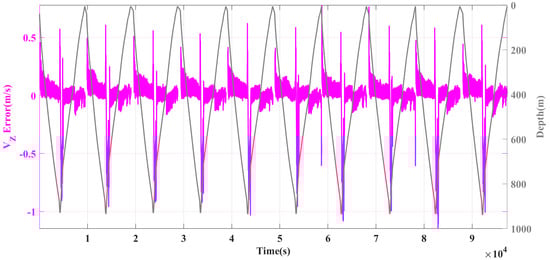 To investigate the motion of UGs within an eddy during the field experiment, the vertical velocity of UG 6 is calculated by the time derivative of depth observed with the pressure sensor [12], as shown in Figure 11. In Figure 11, there exists an obvious consistent pattern in the trend of the vertical velocity between UG 6 and the dynamic model with the smaller values in the deeper water and larger ones in the shallower water during the descent, while the phenomenon is reversed with the larger values in the deeper water and smaller ones in the shallower water during the ascent. To quantify the difference between UG 6 and the model, the errors of the vertical velocity are computed and plotted in Figure 12. Similarly, some peaks during the beginning and the switching period result from the oil flowing inside the UG 6 and the start-up of the oil pump. To calculate the mean error of UG 6 during the stable operation stage, the spikes existing at a depth of 0∼50 m in the descent and 800 m∼940 m in the ascent are removed carefully. Then, the mean value of the absolute errors estimated by UG 6 and the model is 0.0346 m/s, indicating that the dynamic model will be the appropriate choice to analyze the kinematic performance of UGs inside an eddy.