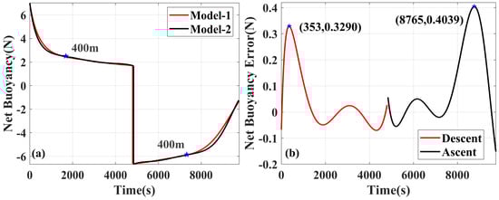 Simulation results of the net buoyancy and net buoyancy error in the vertical plane. (a) Net buoyancy; (b) Net buoyancy error.