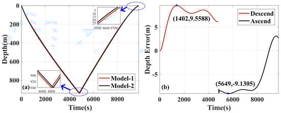 When the movement amount of the attitude adjustment module remains constant, the pitch angle increases with the increasing net buoyancy. It can be seen from Figure 13a that there exists a slight difference in the net buoyancy of Model-1 and Model-2 during the diving (the value less than zero) and climbing (the value greater than zero) stages. The relevant data are listed in Table 3. The net buoyancy decreases from 6.9467 to 1.7168 N during the descent and from 6.6337 to 1.3113 N during the ascent in Model-1, while in Model-2, it changes from 7.0142 to 1.6671 N and from 6.6844 to 1.2418 N in the descent and ascent, respectively. Obviously, there is a difference of about 0.3 N between the beginning of the descent and ascent both in Model-1 and Model-2, resulting from the compression deformation of the hull and variations of the seawater density. The same phenomenon also occurs at the end of the descending and ascending phases, with a difference of about 0.4 N. In Model-1, the net buoyancy varies dramatically between the sea surface and the depth of about 400 m with an average gradient of about 0.0027 N/m and 0.0019 N/m during the descent and ascent, respectively, while it changes slowly between 400 and 940 m with an average gradient of about 0.0002 N/m and 0.0003 N/m during the descent and ascent, respectively. The errors of the net buoyancy between Model-1 and Model-2 are calculated by subtracting the value of Model-2 from that of Model-1, as shown in Figure 13b. In the descent, the error is within the range of −0.0703 N∼0.3290 N, and the maximum value of the errors reaches up to 0.3290 N at 353 s (about 107 m). Similarly, in the ascent, the value range of the error is [−0.1515 N, 0.4039 N] and the maximum value of the absolute errors achieves 0.4039 N at 8765 s (about 129 m). The results indicate that the larger error of the net buoyancy caused by the eddy density mainly occurs near the depth of the thermocline. Moreover, the estimated mean and standard deviation () of the absolute net buoyancy error are 0.0746 N and 0.0916 N, respectively, in the descent. However, they are 0.1150 N and 0.1317 N, respectively, in the ascent, which reveals a stronger influence of eddy density on the net buoyancy of the UG in the ascent than that in the descent.
