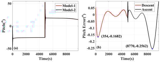 To reveal how the eddy density affects the movement position of the UG, the simulation results of its gliding trajectory and pitch angle are displayed in Figure 15 and Figure 16 and Table 6. In Figure 15a, the two trajectories obtained from the simulation using Model-1 and Model-2 almost overlap. However, the time required for an UG to complete a profile simulated based on Model-1 is slightly longer than that based on Model-2, which indicates that the difference of the out-of-water moments simulated by the two models will keep increasing as the number of UG gliding profiles increases. Compared with the simulation results of Model-2, it takes less time for an UG to dive to the specified depth in Model-1 but more time to climb to the sea surface. In order to discuss the trajectory error in more detail, the error between the trajectories simulated by the two models is calculated, as shown in Figure 15b. It can be found that the error fluctuates in both the descent and ascent. In the descent, the error increases gradually from zero to the maximum absolute value of 9.5588 m at 1402 s, when the trajectory obtained from Model-1 reaches 342.6826 m and that obtained from Model-2 achieves 333.1238 m. Then, the error locates at the larger values and fluctuates with a small amplitude, which is consistent with the phenomenon in Figure 14d, where the error of fluctuates around the value of zero in this stage. In the ascent, the trajectory error reaches the maximum absolute value of 9.1305 m at 5649 s, when the trajectory obtained from Model-1 reaches 755.0830 m, and that obtained from Model-2 reaches 764.2135 m. During the stage of the simulation time larger than 5649 s, the trajectory error also fluctuates near the larger values with a small amplitude and then gradually decreases to zero. Hereafter, it starts to grow in a positive direction because of the error still being greater than zero. When the error of is less than zero, the trajectory error starts to decrease. To compare the effect of the eddy density on the trajectory errors in the descent and ascent, the variations of the absolute trajectory error in the two phases are discussed. In the descent, the mean value of the absolute trajectory error is 7.4059 m with the Std value of 2.2284 m, while in the ascent, the mean and values are 6.7365 m and 2.7849 m, respectively. Obviously, the mean value in the descent is larger than that in the ascent, but the value is smaller. So, the coefficient of variation (, ) is adopted as a normalized index to measure the error dispersion. The is calculated to be 0.3009 for the descent and 0.4134 for the ascent, indicating that the trajectory error in the ascent has the larger variability and the trajectory is more influenced by the eddy density, which is consistent with the conclusions discussed above.
