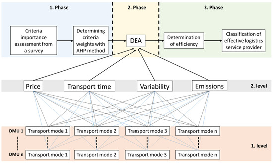 The approach presented (Figure 1) is divided into three phases and two levels. The first phase consists of two steps. In the first step, the importance of the criteria must be determined based on the quantitative analysis of a survey. A distance-based analytical hierarchy process with data envelopment analysis (AHP-DEA) has been employed. This approach, proposed in the study by Bajec [38], is user-friendly and reliable, requiring much less effort from respondents in regards to sorting the predefined criteria in descending order than do pairwise comparisons. Moreover, this method is clear and easy to understand, since it is based on Saaty’s systematic AHP tree structure [39]. In the second step of the first phase, the AHP method is used to obtain criteria weights which are later used in the second phase to reduce the low discriminatory power of the DEA method. In addition to the proposed approach, the method preserves the AHP consistency of the maximum eigenvalues. To verify the respondents’ results, a consistency ratio (CR) must be calculated to evaluate the transitivity of the order of criteria preferences. The consistency ratio is a tool used to evaluate the transitivity of the criteria preference order, which is closely related to the knowledge of the experts and, at the same time, their objectivity in decision making. The consistency ratio is calculated as the quotient between the consistency index and the randomness index. In the case of consistency, CR must be equal to or less than 0.1.