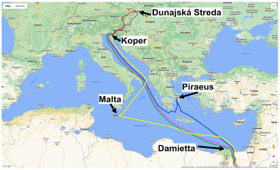 The different modes of the intermodal transport chain were selected based on origin and destination. The selected routes include different combinations (Figure 2) combining direct and indirect maritime transport (via the hubs of Piraeus/Greece, Freeport/Malta, and Damietta/Egypt) with rail or road transport offered by different transport companies. The objective is to identify the most efficient combination of intermodal transport chains, using the evaluation criteria of P, E, TT, and V. The analysis of these criteria is based on a comparison of GHG (greenhouse gases) emissions, transportation time, and transport costs. GHG emissions are presented in calculation results as an equivalent emission of CO2 (CO2). The calculation of emissions was performed for the transport of a container weighing 14 t/TEU (transport equivalent unit). For the determination of the transport route and price, FOB Incoterms terms and conditions were used up to the intermodal terminal in the hinterland, excluding the last mile of delivery from the HT by truck to the consignee.