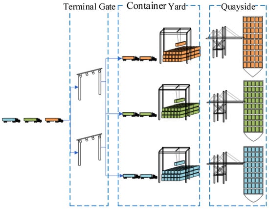 Nowadays, maritime container terminals have to face increasingly tough requirements by shipping companies which claim real-time services [4]. In order to be selected as hub ports or origin–destination points in shipping routes, marine container terminals have to improve their management capabilities and productivity [5,6,7,8]. Furthermore, liner shipping companies continue to increase the scale of deep-sea container vessels, as larger vessels can lower voyage costs per container due to economies of scale. The carrying capacity of container ships has increased significantly over the last 50 years [9]. Generally, the external trucks arrive at the marine container terminal randomly and nonuniformly within the time window assigned to the vessel by the container terminal. If the time window assignment is unreasonable, such as the overlapping of time windows, and the length of the time windows does not match with the volume of outbound containers, it will lead to a large number of trucks moving in and out of the terminal during peak hours. Truck arrivals exceeding the capacity of the gate and yard can lead to heavy congestion.