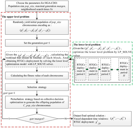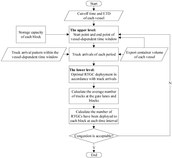 The flowchart of VDTW assignment and RTGC deployment is shown in Figure 2. After the vessel departs, the yard space occupied by outbound containers corresponding to the vessel can be released. It means that the vessel ETD (estimated time of departure), outbound container volume of each vessel and storage capacity of each block directly determine the available storage capacity of each block. However, the starting point of VDTW depends on the available storage capacity of the block where the corresponding outbound containers can be stored [23]. In addition, the ending point of VDTW depends on vessel cut-off time. Therefore, firstly, we assign a specific time window for each vessel according to vessel cut-off time, vessel ETD, outbound container volume of each vessel and the storage capacity of each block. Then, we use the kernel distribution function estimators developed by Nadaraya [33] to estimate truck arrivals of each vessel during each period based on the given set of time windows. Next, we make the optimum RTGC deployment that minimizes the work overflow to the next period of all blocks. According to the RTGC deployment, the number of RTGCs available at each block can be obtained in real time. Afterward, the average number of trucks waiting at the gate lanes and blocks is calculated using the time-dependent queue model. If the congestion is acceptable, the terminal operator will adopt the time windows and informs all the related shippers or distribution centers. Otherwise, the time windows should be modified. Furthermore, the RTGC deployment should be optimized again, and the average number of trucks waiting at the gate lanes and blocks should also be recalculated.