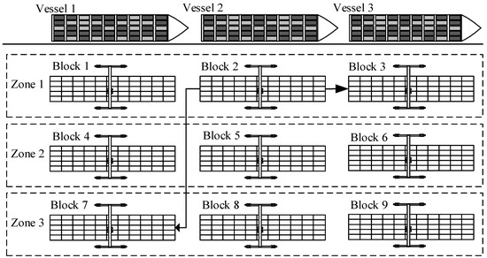 The container yard in a container terminal is divided into several blocks. The terminal operation system will indicate those inbound trucks entering the gate to transport the outbound containers to the designated blocks for storage according to the yard plan. According to the stowage plan supplied by liner shipping company and the storage position of the outbound containers in the yard, the container terminal makes the operation stowage plan. After the vessel is berthed, the container terminal will command the internal trucks and quay cranes to complete the vessel loading and unloading, cooperatively, according to the operation stowing plan [34]. The most commonly used yard cranes in the container yard are RTGC and rail mounted gantry cranes (RMGCs). Because the outbound containers of different vessels are stored in different blocks, the distribution of the outbound containers and inbound trucks flow in the container yard is unbalanced in time and space. In order to make full use of the operational capacity, the yard cranes need to be transferred to the blocks with more tasks after completing a small number of tasks in the idle blocks. Therefore, compared with RMGCs, which are fixed to a block, RTGC deployment is more meaningful for improving yard operation efficiency. As shown in Figure 3, a row of blocks, parallel to the shoreline, constitutes a Zone (e.g., blocks 1, 2, and 3 belong to Zone1, blocks 4, 5, and 6 belong to Zone2). The RTGC can move freely between two adjacent blocks in the same Zone. If a RTGC wants to move from a block in one Zone to a block in another Zone (e.g., move from block 2 to block 7), the RTGC needs to make two 90° turns. In addition, RTGCs cannot cross each other generally, so one RTGC cannot cross other blocks when transferring from one block to another. For example, the RTGC shown in Figure 3 cannot directly transfer from block 1 to block 3, 6 or 9.