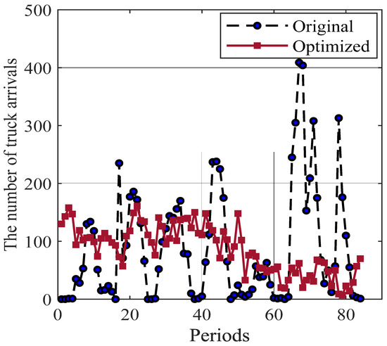 The container terminal allocates a time window to each vessel by assigning the open time and cutoff time of the container yard to each vessel’s outbound containers. Furthermore, the distribution of inbound truck arrivals during the time window obeys some laws. The cumulative distribution function of outbound container arrival rate during the time window can be obtained by the probability distribution fitting method based on the historical data of vessels’ time windows in the past voyage and the arrival time of outbound containers. After obtaining the arrival time distribution of outbound containers in the time window, truck arrivals can be controlled by rationally assigning the time window. This truck arrival management method is named ‘vessel-dependent time windows’ (VDTWs) [21,22].