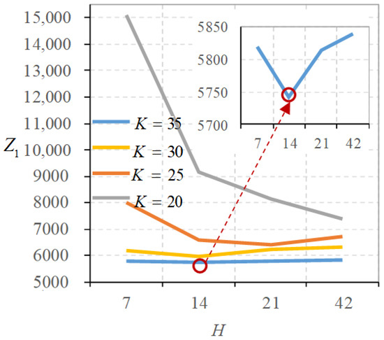 The arrival rate of the inbound trucks varies with time. Ma et al. [24] found that the arrival of inbound trucks is a non-homogeneous Poisson process, and the gate service time follows the Exponential distribution. Therefore, we selected a non-stationary multi-server Exponential–Exponential queueing model (i.e., ) to analyze the terminal gate system. The point-wise fluid-based approximation method has been successfully used to model this non-stationary queuing system. In the point-wise fluid-based approximation method, the planning horizon is decomposed into a sequence of time intervals and the system state of each interval can represent this non-stationary queuing systems. Equation (8) calculates the number of trucks arriving at terminal gate at interval . Equation (9) maintains the fluid balance between consecutive intervals, which means that change in the queue length at terminal gate is equal to the average number of arrivals minus departures. Equation (10) calculates the discharge rate of trucks at the terminal gate at interval . Equation (11) can be used to estimate average queue length in a queuing system.