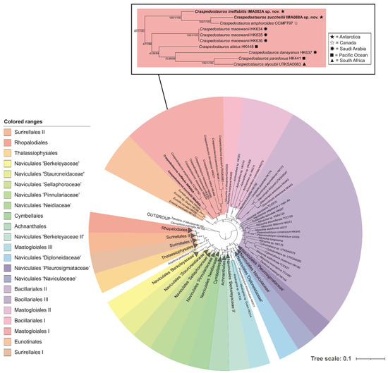 Traditionally, the taxonomic identification of diatoms mostly relied on the morphological features of the frustule [1] followed by other characters, such as ultrastructure, sexual reproduction and the development of auxospores [2]. Recently, the advent of molecular tools and “omics” sciences has provided more reliable methods for the study of the molecular and chemical diversity of microalgae and seaweeds [1,2,3]. The combination of morphological, molecular and chemical data, referred to as the polyphasic or integrative approach [4,5], does not only provide an insight into the evolutionary relations among diatom species, but could also deliver useful information on the functioning of diatoms [1]. This study aims to evaluate the different shades of photosynthetic biodiversity (morphological, ecological, molecular and chemical diversity) of two species of diatoms of the genus Craspedostauros E.J. Cox collected and isolated from the Ross Sea (Antarctica) during the XXXIV Italian Antarctic Expedition. Craspedostauros is a relatively small genus of raphid pennate diatoms, characterized by the “stauros”, which is an internal transverse rib of silica at the center of the valve [6,7]. This genus was distinguished by Cox, 1999 from Stauroneis Ehrenberg, according to the following morphological features: (1) cribrate areolae, (2) plate-like plastids with central pyrenoids, H-shaped in valve view, located “fore-and-aft” of the center of the cell, and (3) a central fascia (a transverse hyaline area of the valve) wider than the associated stauros [6,7]. The addition of novel molecular data to the traditional systematic tools has shed light on the evolution and the diversity of the genus Craspedostauros, with the description of novel species and the taxonomic revision of several genera [6,8]. However, while morphological data demonstrated the non-monophyletic nature of the stauros across raphid diatoms [7,9], in 2017, Ashworth et al. [6] highlighted several problems with the phylogenetic position of the genera Craspedostauros and Staurotropis T.B.B. Paddock by testing if the topology implied by a morphology-based tree was significantly different from that recovered from analysis of a DNA based tree. We followed this approach performing a phylogenetic analysis of the concatenated 18S rDNA, rbcL and psbC gene alignment based on the molecular dataset used by Ashworth et al. 2017 [6] expanded by including the sequences of Craspedostauros danayanus Majewska & Ashworth and Craspedostauros macewanii Majewska & Ashworth [8] and those generated in this study from the Antarctic diatoms strain IMA082A and IMA088A. Moreover, we assessed the robustness of trees constraining the monophyly of: (1) Mastogloiales: Craspedostauros, Achnanthes Bory, and Mastogloia Thwaites ex W.Smith (CAM); (2) quadrate rotae taxa: Craspedostauros, Staurotropis, Achnanthes and Mastogloia (CSAM) and the genera Craspedostauros and Achnanthes (CA), which were reported as sister taxa by Ashworth et al. 2017 [6].