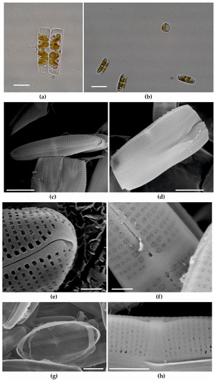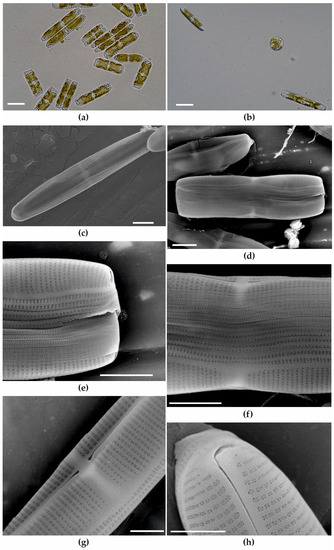 Light (a,b) and scanning electron images (c–h) of Craspedostauros zucchellii IMA088A. Scale bars: (a) = 10 μm; (b) = 20 μm; (c,d,g) = 5 μm; (e,f,h) = 1 μm.