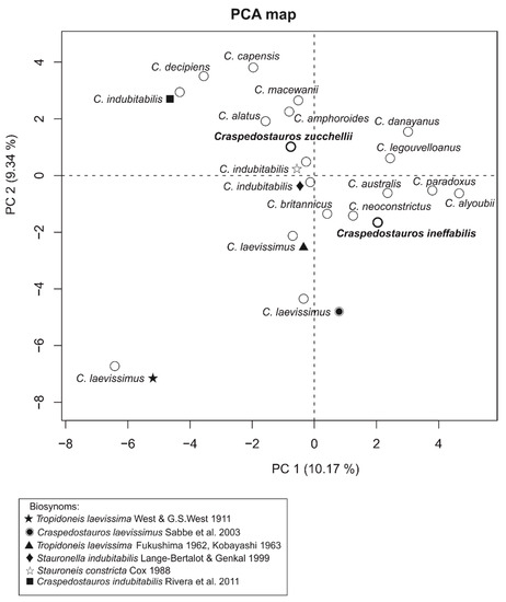 Principal component map showing morphological and ecological dissimilarities between Craspedostauros species [46,47,48,49,50,51,53].