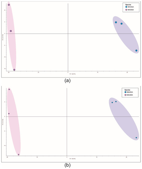 Principal components analysis (PCA) of metabolomic profiles of C. ineffabilis IMA082A and C. zucchellii IMA088A. The x- and y-axes represent principal components 1 and 2, respectively, while the percentages in brackets indicate how much of the overall variance in each dataset is explained by each principal component. Chemical profiles of three independent replicates were analyzed per Craspedostauros strain. (a) Positive ion mode; (b) Negative ion mode.
