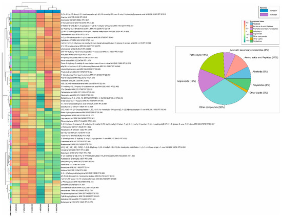 Feature analyses for candidate biomarker selection (p-values < 0.005). Hierarchical clustering heat map of metabolites between groups in positive ion mode. Colors from red to green indicate the normalized relative abundance values of metabolites from low to high according to the scale bar. Samples of C. ineffabilis IMA082A (blue) and C. zucchellii IMA088A (violet) are disposed in columns; replicates are indicated with suffix numbers 1, 2 and 3. Compound classes are indicated in different colors and percentages of each class are reported on the right side of the figure.