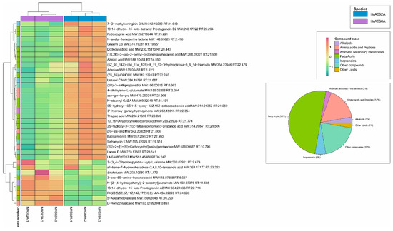 Initially, principal component analysis (PCA) was carried out in Compound Discoverer to investigate clustering patterns in the dataset. Subsequently, ANOVA test on normalized signals of each identified metabolite was carried out in Compound Discoverer to evaluate the statistical differences (p-value < 0.005) among the metabolomes of IMA082A and IMA088A. A hierarchical clustering of the statistically significant metabolites was implemented in R-Statistics® 3.5.3 version.