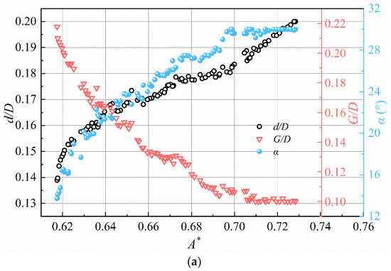- The response surfaces show that there is an extreme value of A* under different combinations of variables. Among them, d/D shows a different synergistic effect from the other two variables. When d/D = 0.1, G/D achieves the minimum value of A* at the median value; when d/D = 0.3, G/D achieves the minimum value of A* at the upper limit and displays a monotonically decreasing trend. Unlike A*, the extreme point of CD occurs in the case of larger d/D and α, and small G/D.