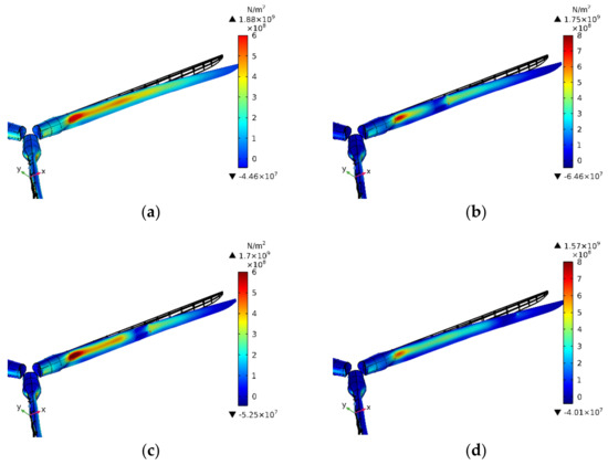 To find the influence of the RCC location on blade stress response, a series of finite-element analyses are conducted using COMSOL Multiphysics software. The FE models of wind turbine with and without the reinforcing structure are analyzed separately. The connecting point of reinforcing cable is set from one third of the blade length to the blade tip along the spanwise direction. The corresponding Von Mises stress response of blade 1 is displayed in Figure 9.