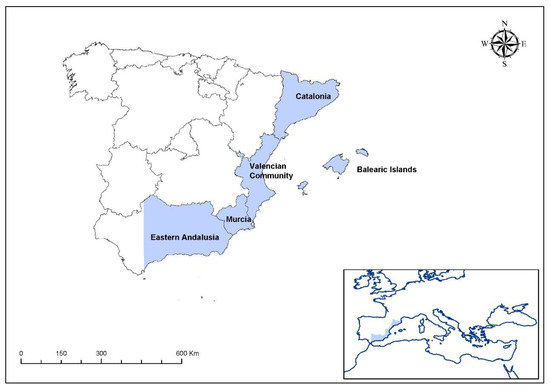 Our study focuses on the Mediterranean coast of the Iberian Peninsula, which extends more than 2000 km through Catalonia, Valencia, Murcia and Eastern Andalusia. Sitting opposite this coastline is the archipelago of the Balearic Islands with some 1428 km of coastline of great ecological value (Figure 1).