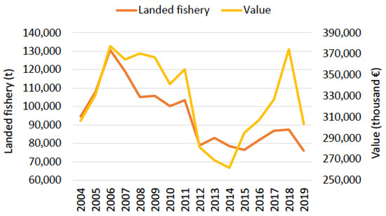 Evolution of the landed fishery (live weight) and its value in the Spanish Mediterranean (2004–2019). Annual average values 6.