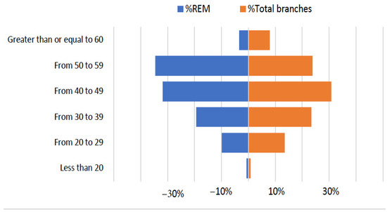 Population pyramid of the ages of workers affiliated to the REM and to the total SS branches in the Spanish Mediterranean in 2020 9.