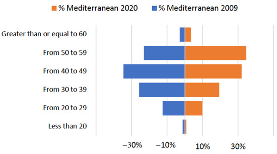 Comparison of the population pyramid of workers affiliated to the REM in the Spanish Mediterranean in 2009 and 2020 10.