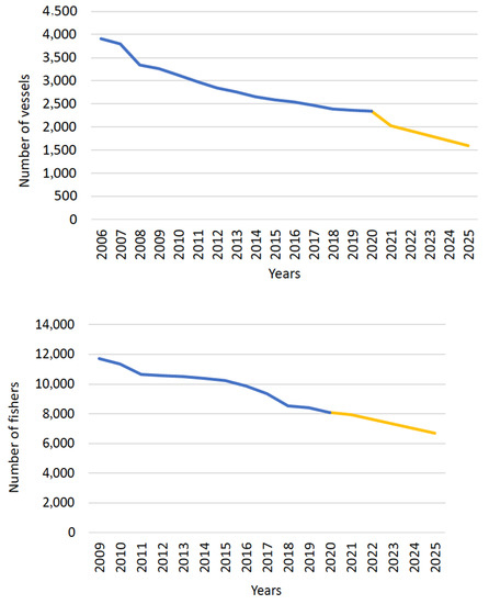 By performing a simple linear regression 11 for each variable, considering years as an independent variable and boats and fishers as dependent variables for each regression, two equations are obtained (Equations (1) and (2)). By applying these equations, it is possible to deduce to what extent the number of boats and crew will decrease in the future.