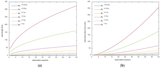 To sum up, in the case that the positioning accuracy of the control points in the seafloor PNT network and the number of observation sessions are given, the side length of the unit network can be determined based on Equation (31). Furthermore, if the positioning precision and the side length of the unit network have been given, the optimal number of observation sessions can be determined.