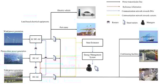 The increasing logistics demand of the world maritime industry has led to higher energy consumption and carbon emissions []. To reduce carbon emissions, the proportion of clean energy of the maritime industry is increasing. As an important part of the maritime industry, the seaport microgrid undertakes the task of shaping the green and low-carbon maritime transportation. A seaport microgrid has a higher proportion of renewable energy compared with a conventional microgrid [], which easily causes voltage and frequency deviations due to a strong randomness. Therefore, it is essential to investigate the distributed secondary control problem for a seaport microgrid to maintain its stability [].