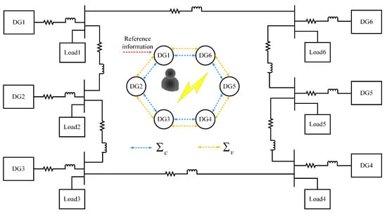 A seaport microgrid is actually a multiagent system (MAS) []. The distributed secondary control of the seaport microgrid relies on the communication network between the DGs. However, the traditional single-IP carrier communication network cannot support various types of data packets exchange between the heterogeneous DGs from different manufacturers. A polymorphic network [] can support the coexistence and collaboration of multiple communication modes by programmable hardware, which can break the restraint of an IP network for information exchange between the heterogeneous DGs. Therefore, how to construct a seaport microgrid under a polymorphic environment is crucial to the distributed secondary control for the heterogeneous DGs. As a crucial node in the port’s Internet of things (IoT) [,,], the seaport microgrid attracts potential adversaries because of its public network. When the attacks are launched into the communication network, the consensus performance of the DGs is destroyed. The seaport microgrid faces the risk of a power outage [,]. Once a power outage occurs, the electric-driven devices (such as cranes, handing machines and belt-conveying machines) are not able to maintain normal operation, causing huge economic losses. Therefore, how to defend against potential attacks on the seaport microgrid has been widely focused on.