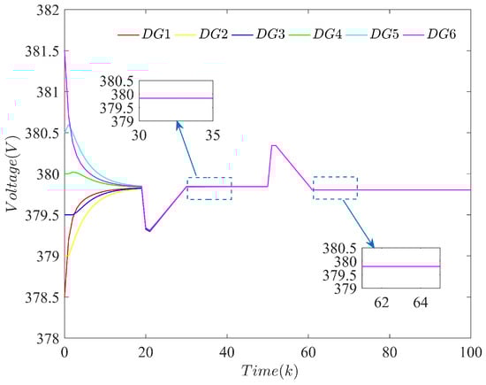 This case study provides simulation cases to illustrate the applicability of the proposed strategy when there exists a load disturbance and no attacks. As shown in Figure 4, loads 1–5 of the seaport microgrid are connected to the seaport microgrid at the initial time, while load 6 is disconnected. When , load 6 is connected to the seaport microgrid, and load 5 is disconnected from the seaport microgrid when . The voltage performance of each DG during this period is shown in Figure 5. From the simulation results, it can be seen that the proposed strategy can maintain the voltage stability after a short period of fluctuation, regardless of whether the load is connected or disconnected. Obviously, it shows that the proposed strategy is also applicable under the normal operation of load disturbance and no attacks.