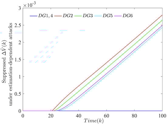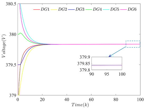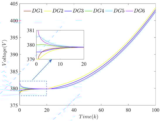 This case study prefers to focus on the effectiveness of the proposed strategy (21)–(23) against the estimation-dependent attack. As shown in Figure 9, the voltage of each DG still converges to 380 V under the estimation-dependent attack by using the proposed strategy. Compared with the strategy in [], this shows the proposed strategy can suppress the impact caused by the estimation-dependent attack.