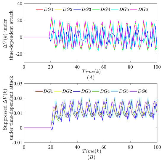 Estimation difference of the DGs using different resilient strategies under the time-dependent attack: (A) the strategy in []; (B) the proposed strategy.