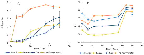 Growth profile (A) and pH variation (B) of D. psychralcaliphila JI1D, in the absence (orange) or the presence of arsenic (light blue), copper (yellow), and zinc (blue).
