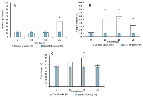 Uptake of arsenic (A), copper (B), and zinc (C) by D. psychralcaliphila JI1D biomass. The white bars represent the yield (%) of metal uptake during the treatment with D. psychralcaliphila JI1D. The grey bars indicate the yield (%) in the controls in the absence of bacterial cells (medium plus metal), due to metal precipitation. Data are presented as mean ± standard deviation (SD); n = 3. Student’s t-test was used to compare means between groups. The * indicates a statistically significant (p-value < 0.05) difference between metal uptake and the basal efficiency.
