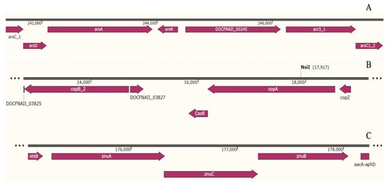 The genetic arrangement of genes with respect to arsenic (A), copper (B), and zinc (C) resistance and transporting systems in D. psychralcaliphila JI1D.